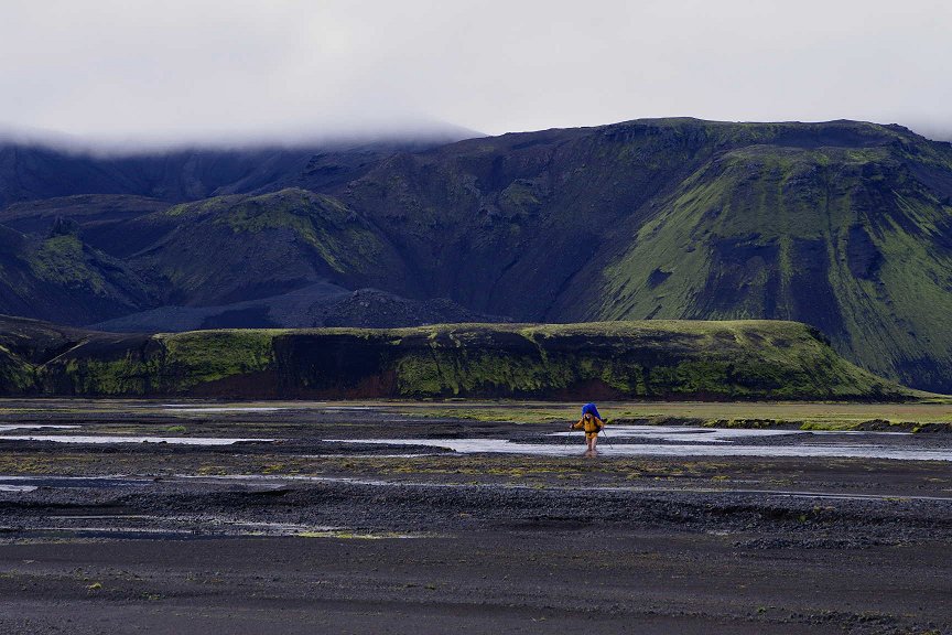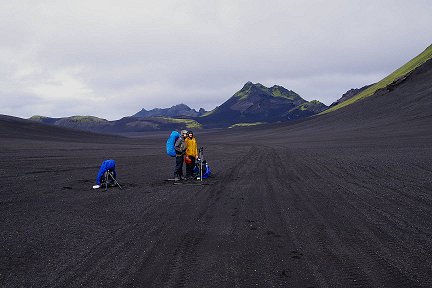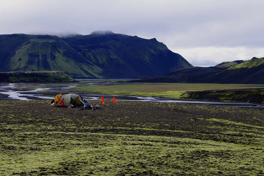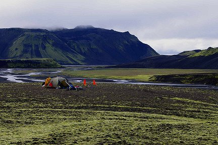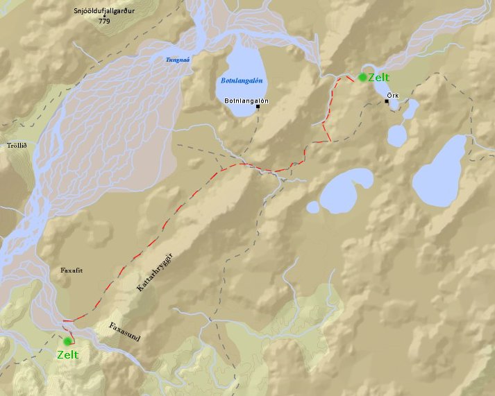 Die letzten Tage der Tour stehen bevor. Zunächst ist Faxasund das Ziel. In der Nacht begann es zu regnen. Noch bei Regen starteten wir gegen 14 Uhr. Das Wetter besserte sich zusehends und dann wurde es doch eine ganz entspannte Wanderung entlang der Kattar- hryggir. Etwas Sonne am Abend . | During the night it began to rain. So we started walking rather late about 2 pm. The weather became better. So we walked rather relaxed to Faxasund. Nice evening with some sunshine. |